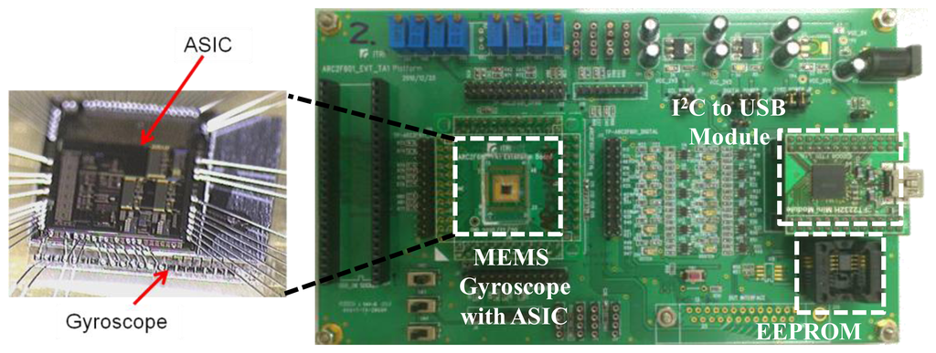 A scanning electron microscope (SEM) photograph of the fabricated micro-gyroscope is shown in Figure 15, in which the die size is 1,278 μm × 1,300 μm. Moreover, the microphotograph of the designed ASIC using 0.25 μm 1P5M CMOS standard process is shown in Figure 16, where the die size is 2,756 μm × 2,519 μm. In order to verify the function and the performance of the designed ASIC and the proposed TBD compensation system, respectively, the fabricated micro-gyroscope is integrated with the ASIC using wire bonding for the experimental setup as shown in Figure 17. Furthermore, an active compensation system is integrated in the ASIC to derive the frequency signals from the MEMS gyroscope and the embedded Si-oscillator. In addition, an USB to I2C module is adopted on the PCB for the communication between the micro-gyroscope and the PC. The calibration codes and system parameters can be written in the EEPROM by using I2C through this module.
