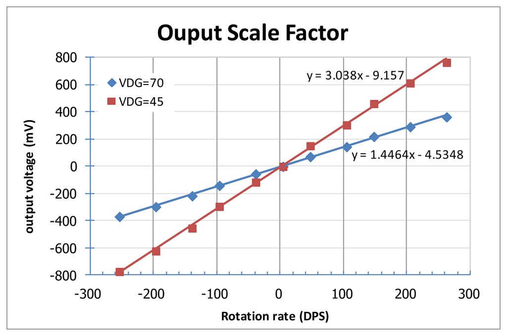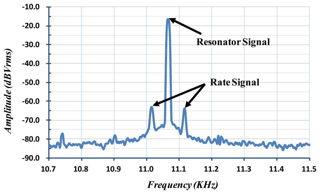 Some experimental results of the fabricated micro-gyroscope are shown in Figures 18 and 19 to verify the function and performance. In the designed ASIC, a feedback loop and an AGC circuit are adopted as shown in Figure 5 to feedback the resonator's output signals for its self-oscillation. As the power up and white-noise applied, the resonator achieves self-oscillation by incessantly positive feedback. Moreover, the amplitude of the resonator can be controlled by the set reference voltage of the peak detector in the AGC circuit. Figure 18 shows the spectrum of the output signal when the device is subject to an 80 °/s rotation. The resonant frequency of the self-oscillated resonator of the fabricated vibratory micro-gyroscope is about 11.07 kHz. On the other hand, the resonant frequency of the Coriolis accelerometer in micro-gyroscope can also be adjusted by adjusting the supply voltage on the e-spring electrodes. By using the frequency adjustment methodology, the frequency match (i.e., mode-matching) in drive-mode and sense-mode can be accomplished to obtain the high efficiency in delivering energy from the drive axis to the sense axis. Furthermore, the PCB is attached on a rate table with excited angular rate ranging from −250 to +250°/s to obtain the performance of the fabricated MEMS vibratory micro-gyroscope. The output scale factor of the vibratory micro-gyroscope from −250 to +250°/s is shown in Figure 19.