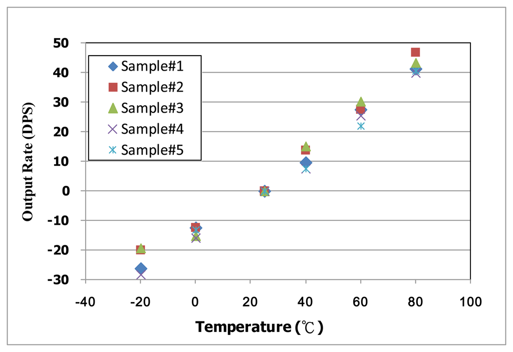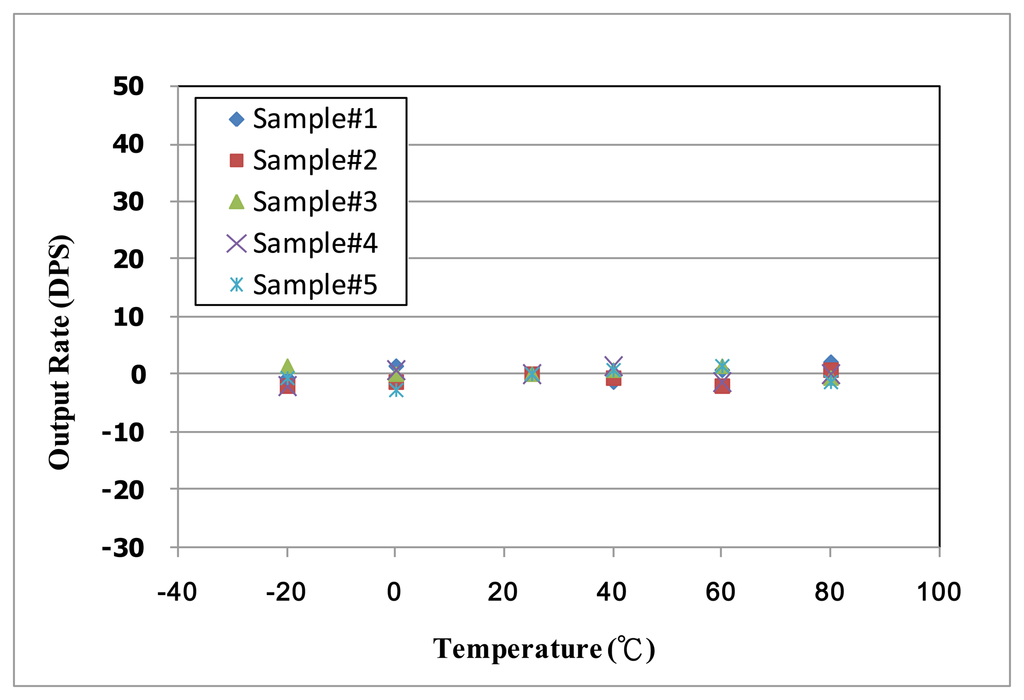 After the basic characteristics experimentation of the fabricated micro-gyroscope, the implementation of the proposed TBD compensation system is discussed. Some experimental results of the proposed active thermal compensation system are shown in Figures 20 and 21. As shown in Figure 14b, the current temperature can be estimated by the temperature dependent count number. It is noted that three preset temperatures, 25 °C and 40 °C and 80 °C, are utilized to calculate the coefficients of the second order temperature fitting circuit. On the other hand, the capability of the TBD compensation is also discussed. The output of the designed delta-sigma readout circuit can be adjusted by the calibration code ΔVJ, which is adapted by the proposed active thermal compensation system. To evaluate the performance of the proposed TBD compensation system, the output signal of five fabricated micro-gyroscopes without TBD compensation are investigated and shown in Figure 20. As shown in Figure 20, the bias-drifts of these samples under temperature from −20 °C to 80 °C are about 0.63 DPS/°C. By adopting the proposed active thermal compensation system, the TBD can be compensated under ±0.03 DPS/°C as shown in Figure 21. From the experimental results, the undesired TBD can suppress effectively by using the proposed active thermal compensation system.