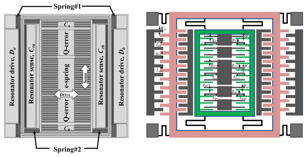 The schematic illustration of the proposed 2-DOF vibratory micro-gyroscope is shown in Figure 3. It mainly consists of a vibrating resonator part and a Coriolis accelerometer part, which are arranged in outer and inner positions, respectively. The vibrating resonator part, comprises vibratory comb-drive electrodes (Da and Db), flexure springs (spring #1) and sensing capacitor set (Cra and Crb). In the Coriolis accelerometer part, flexure springs (spring #2) and sensing capacitor set (CA and CB) are designed as the angular rate sensing element to detect the responding motion induced by the Coriolis effect. In this design, a differential capacitive sensing mechanism is employed for acquiring high element sensitivity, linearity, and low temperature bias-drift. Moreover, a comb-driven electrode (e-spring) is utilized to adjust the resonant frequency of the Coriolis accelerometer. Furthermore, two comb-driven electrodes (Q-error) are designed to compensate the quadrature error, which is induced by the errora in the fabrication process of the sensing element. These comb-driven electrodes and the related error compensation will not be discussed since the proposed active thermal compensation system is the emphasis in this study. However, the research of the related quadrature error compensation can be found in the literatures [16, 17]. The detailed structure dimensions of the proposed micro-gyroscope are listed in Table 1. The natural frequency of the resonator is about 11 kHz as simulated via ANSYS.