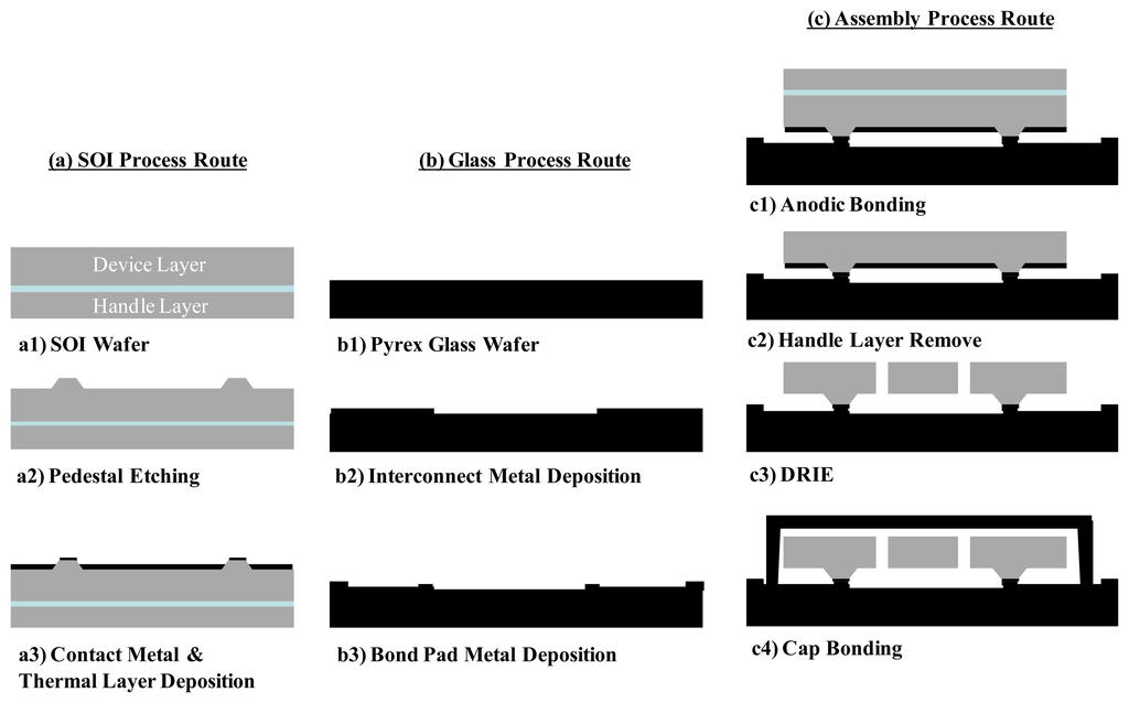 The structure of the designed micro-gyroscope is fabricated using SOG-bulk micromachining and deep reactive ion etching (DRIE). The process flow, as shown in Figure 4, includes SOI route, glass route and assembly route. In the SOI wafer process, the pedestals are etched on the device layer first. Then, the contact metal and thermal layer are deposited. In the process of glass wafer, interconnect and bond pad metals are deposited to place interconnect/capacitor plates and bond pads separately. In the assembly process, SOI and glass wafers are assembled together by precision alignment and anodic bonding after their processes completed respectively. After the handle layer is removed, DRIE is adopted to etch the patterning structure of the device. DRIE is used in this step to etch trenches of 50 μm depth and minimum 3 μm width. This simple and robust process offers excellent control of structure thickness and desired stiction immunity during fabrication that is essential for high yield in manufacture. Finally, the fabricated gyroscope is hermetic packaged by a silicon cap in the vacuum chamber.