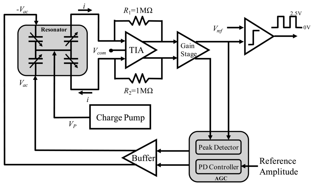 Since the resonator is all the time driven into resonance, a driving-loop circuit is designed to self-oscillate the resonator in the micro-gyroscope. The relative block diagram of the closed-loop control for the micro-gyroscope resonator is shown in Figure 5. To detect the induced current of the driven comb fingers, a differential TIA is designed as well as a 1 MΩ feedback resistance is utilized to transform current into voltage [18]. Then, the output signal is amplified by a gain stage and feedback to the driving comb fingers for self-oscillation. Moreover, to avoid the signal saturation due to the positive feedback, an AGC circuit is adopted in the feedback path. In the AGC circuit, the peak detector detects the amplitude of the resonator output sensed by TIA is compared with the reference amplitude first. Then, a proportional differential (PD) controller is adopted to minimize the error between these signals. Finally, the anti-phase driving output of the AGC circuit is then feedback to driving comb fingers of the resonator through a buffer stage. By using the AGC circuit, the amplitude of the resonator output can be kept at same level. Besides, no extra phase shift circuit is needed since the TIA circuit can create 90 degree phase shift to compensate the resonance phase change [19].