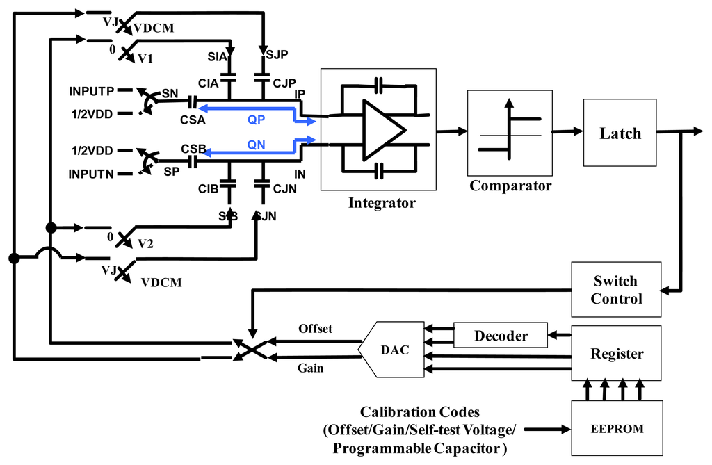 Figure 8 shows the proposed Coriolis signal readout circuit architecture with a gain/offset trimming function. To detect the capacitance variation of the vibratory micro-gyroscope, the same TIA used in the resonator driving loop is adopted as an analogue front end (AFE) for Coriolis signal readout. Moreover, a gain stage is adapted to amplify the output signal and send to an asynchronous demodulation circuit. The output signal of the demodulator is then feed into a delta-sigma ADC. Although the micro-gyroscopes are fabricated under same process flow, there always are some variations among different sensing elements. To ensure the consistency of the output performance of the designed micro-gyroscopes, a calibration method is designed in the delta-sigma ADC to adjust the offset and sensitivity of the sensing elements. The block diagram of the delta-sigma ADC is shown in Figure 9, where CSA and CSB are the sample-and-hold capacitors, CIA and CIB are the gain trimming capacitors as well as CJP and CJN are the offset trimming capacitors. Furthermore, the inputs of voltages of CIA, CIB and CJP, CJN are continuously clocked under two clock phases, UNITY and INTEGRATE. The input of CIA and CIB are switched between the ground voltage and the calibrated voltage VDCM-VDG or VDCM+VDG depending on the comparator output. On the other hand, the input voltages of CJP and CJN are always switched between the common voltage VDCM and the calibrated voltage VDCM +VJ no matter what the comparator output is. All of the calibrated voltages are defined by the DAC output that according to the calibration codes. Furthermore, the programmable capacitor codes and the gain/offset calibration codes are determined for a particular sensing element during the calibrated operation and stored in EEPROM.