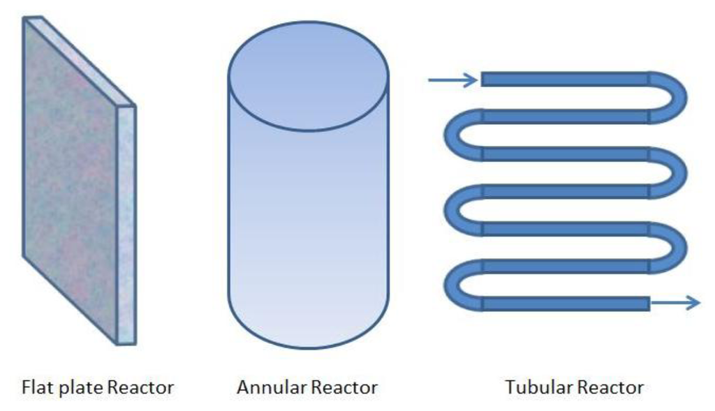 An important factor of PBRs to maximize the growth conditions is their design, that is, the geometry employed to get an efficient distribution of light. The most common closed PBR geometries are the flat plate, the annular, and the tubular ones (see Figure 1). A complete description of these categories is given in [9].