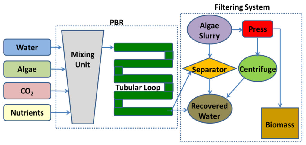 Even though not all PBRs look alike, they basically work in the same way. A working schematic of a generic tubular PBR system for outdoor microalgae culture is shown in Figure 2.