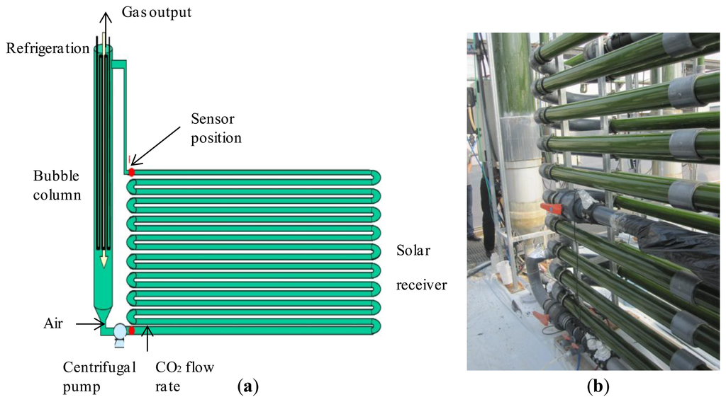 An outdoor microalgae culture only needs nutrients, sunlight, and carbon dioxide to grow. From a mixing unit, the culture flow usually progresses to a pump which moderates the flow into the tube. Built into the pump is the CO2 inlet valve. The tubular loop itself, which acts as a solar receiver, is used to promote the biological growth by controlling the environmental parameters. Different sensors are usually available in the tubular loop such as oxygen sensors to determine how much oxygen has built up in the plant, or pH or temperature sensors. Once microalgae have completed the flow through the tubular loop, they pass back to the mixing unit. Efficient mixing should be provided in this unit in order to produce a uniform dispersion of microalgae within the culture medium, thus eliminating light gradients or for distributing the nutrient concentration. Likewise air is bubbled through the bottom of the mixing unit to provide good overall mixing, sufficient supply of CO2, and efficient removal of O2. At this stage, an optical sensor determines the harvesting rate. When the microalgae are ready for harvesting, they pass through the connected filtering system. This filter collects the microalgae ready for processing, while the remaining microalgae pass back to the mixing unit. After harvesting water with nutrients can be added to the mixing unit.