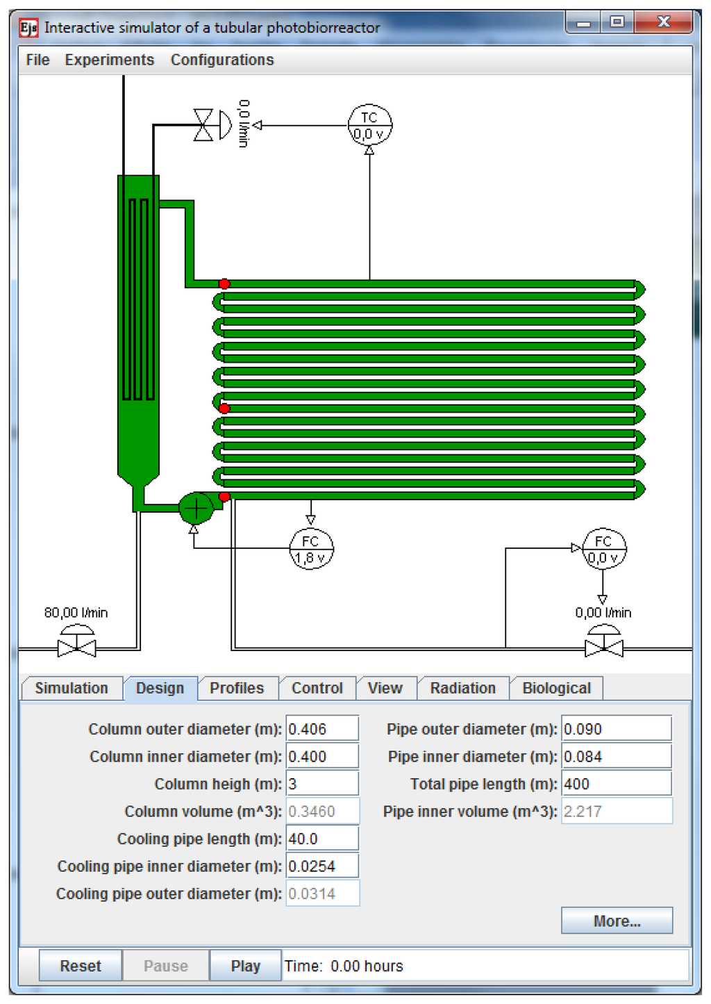 Figure 4 shows the main window of the simulator. It displays the schematic representation of the PBR, which has been made as self-explanatory and realistic as possible. In the figure, the different components of the system can be clearly visualized. The mixing unit is represented by the vertically-oriented bubble column and the solar receiver is the horizontally-located tubular loop. In this simulation tool the fence-like vertically horizontal stacked PBR is simulated. It is not possible to simulate other configuration like for example a horizontal (on the ground laying) PBR. The color of the bubble column and the tubular loop varies from pale to dark green according to the instantaneous biomass concentration. Along the tubular loop, there are three red circles pointing to the places where the sensors of pH and temperature are located. Also, there is a centrifugal pump at the output of the bubble column to circulate the culture and pure CO2 is supplied on demand for pH control after the pump output. Before the centrifugal pump and at the bottom of the bubble column, there is a manual valve to supply air to the column (air flow rate) for the oxygen desorption.