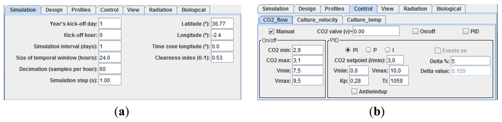 At the bottom part of the main window there are six panels which allow not only changes in multiple parameters of the system but also the management of the system operation process in a proper way. In the Simulation panel different parameters associated with the global radiation model or the simulation interval in days can be modified interactively (see Figure 5a). When changes in physical parameters of the PBR are required such as the pipe and column lengths or the column and pipe diameters, Design panel must be selected (see lower part in Figure 4).