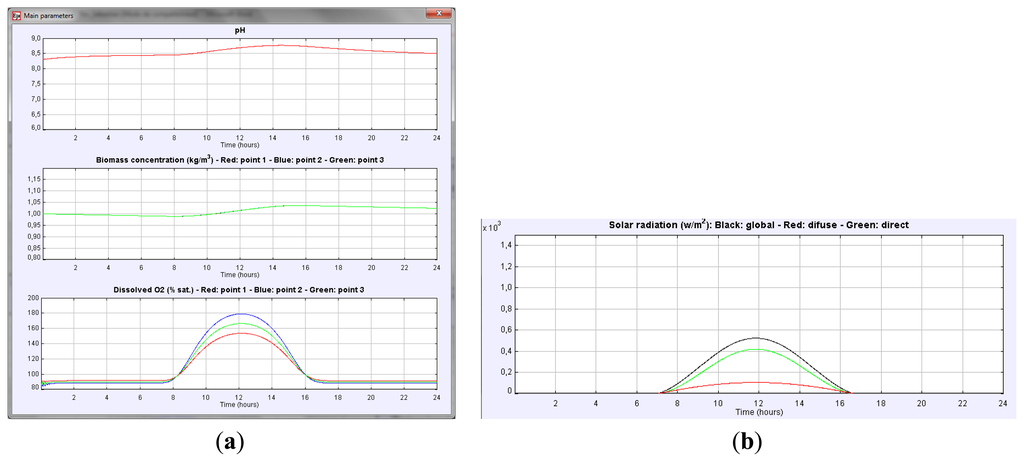 As it can be observed, the dissolved O2 in the culture and the pH present a similar behavior. Dissolved O2 increases in the morning, reaching the maximum at midday, whereas in the afternoon, a decrease in dissolved O2 is observed due to a reduction of the photosynthesis rate. This variation indicates the existence of an oxygen accumulation term. Variation of culture pH is similar. The higher the solar irradiance is (see Figure 6b) the higher the pH of the culture is. Note that the solar radiation profile is easily obtained just by checking the global radiation button in the View Panel. The biomass concentration increases during the daylight period. Thus, accumulation of biomass in the reactor takes place.
