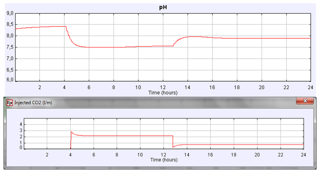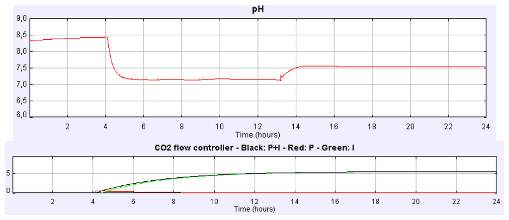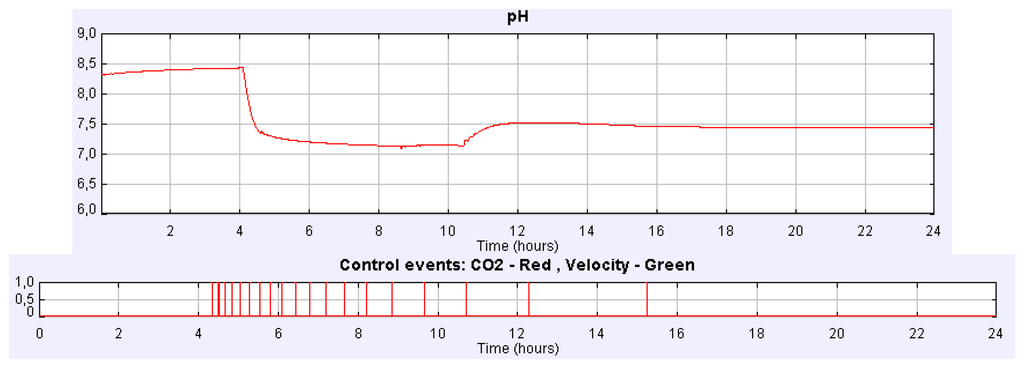 Suppose we address a similar experience setting the CO2 flow rate to 2.16 L/min but using instead the PI control implemented in time-based mode. Figure 8 displays the pH culture evolution for such a case. The steady state of the culture pH is reached again at 7.5. In Figure 8 the evolution of the controller signals can be observed.