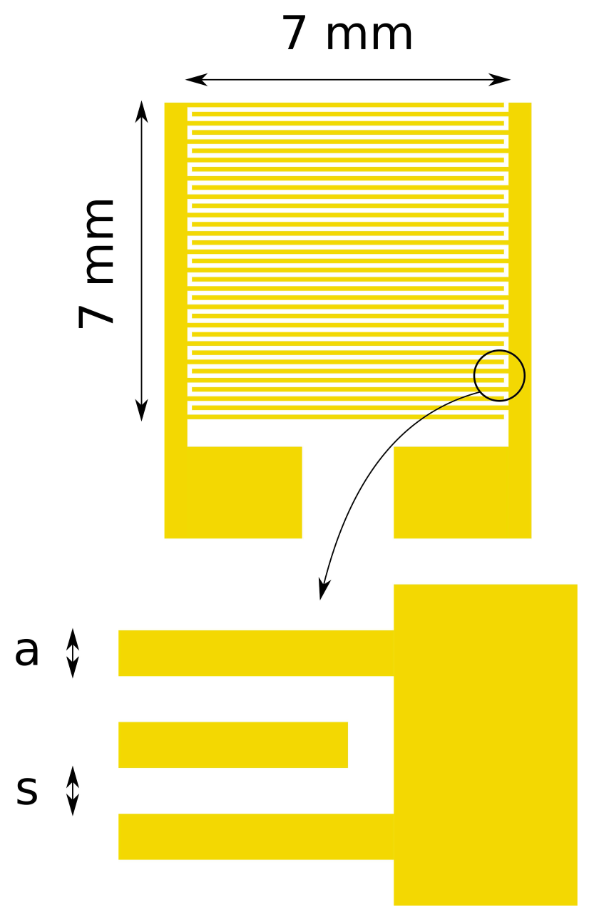 The interdigitated electrodes were produced by conventional lithographic techniques. A silicon wafer with an insulating layer of silicon oxide of 1.5 μm thickness was used as the substrate. Metal layers were deposited by metal evaporation: first, a 10 nm-thick chromium layer, to improve the adherence of the upper layer, and a 100 nm gold layer on top of the chromium layer. Electrodes were patterned by chemical etching. Figure 1 shows a layout of the electrode structure. The active area in which electrode fingers extends is a square with 7 mm sides. Four different types of electrodes were produced on a single substrate, modifying the separation and width of the fingers in order to measure the electrical an optical characteristics of the polymer layer with different electrode geometries. The separation (s) and width (a) of the metal fingers are summarized in Table 1. The effective width of the serpentine gap between the two electrodes (w) of a single photodetector has been calculated following the work of Zaretsky et al. [18] and is also included in Table 1.