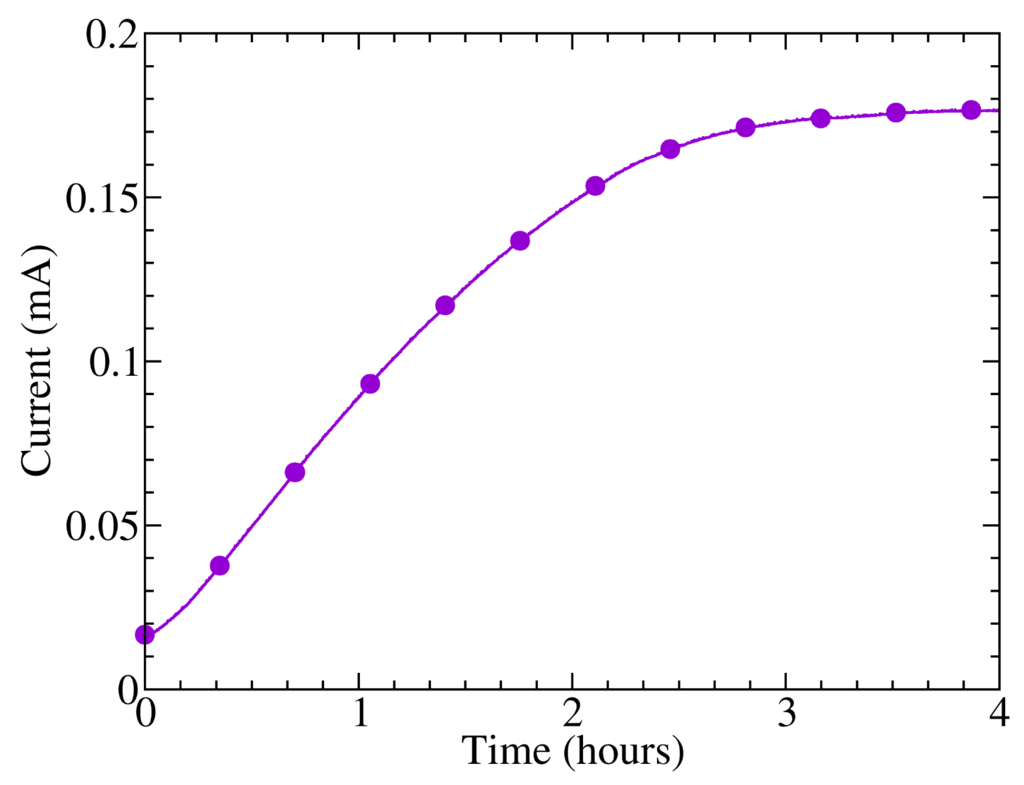 Figure 2 shows the evolution of the current from the photodetector 10:20 biased with a voltage of 10 V in darkness immediately after its introduction into the atmosphere. It can be observed that there is an increase of the dark current during the first three hours of environmental exposure and subsequent stabilization, which could be attributed to this effect. Smaller, long-term current variations were also observed, as the sample was kept in the same conditions, probably due to the change of other environmental variables, such as temperature, as will be shown later, or humidity [21]. Besides, a recovery of the initial current values was observed as the samples were reintroduced in vacuum, producing the desorption of the oxygen dissolved in the polymer layers and a reduction in the charge donor-acceptor centers. Other authors report time responses of 40 min in thin film P3HT transistors after the application of 10 atm O2 from vacuum [20]. However, the change of conductivity after exposure to oxygen can take several days to reach equilibrium in the case of oligothiophenes [22], which are known to show a higher degree of crystallinity and, hence, a lower oxygen diffusion coefficient.