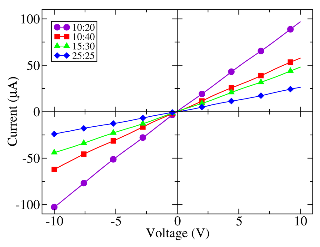 A series of measurements of the voltage-current characteristic of each of the samples at room temperature and darkness were performed to assess the dependence of the resistance of the electrodes on their geometry. As shown in Figure 3, a pure resistive behavior is found, since the polymer layer has a linear current-voltage characteristic in the range of measurement. This figure shows that the current for a particular bias is higher for shorter finger separations and wider electrode gaps, as expected for any resistive element [23]. The influence of the finger separation and electrode effective width can be observed through the comparison of samples 10:40, 10:20 and 25:25 the highest current, or minimal resistance, is found in sample 10:20 (R10:20 = 97 kΩ), with a minimum electrode spacing and a maximum width of the gap. Reducing the channel width keeping the finger separation constant increases the resistance (sample 10:40, R10:40 = 227 kΩ). A broadening of the finger separation holding the electrode gap is followed by a further increment of the resistance (sample 25:25, R25:25 = 415 kΩ). Sample 10:40 and 10:20 have the same finger separation; however, the later has a gap 1.7 times wider than the former. Sample 25:25 has almost the same effective width as sample 10:40, but a finger separation 2.5 times larger.