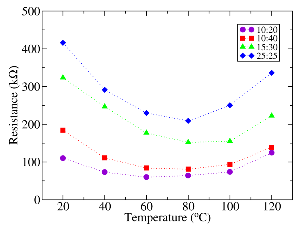 The current voltage characteristics of the samples were measured in a range of temperatures between 22 and 120 °C. The evolution of the photodetector resistance with temperature calculated from these measurements is shown in Figure 4. For low temperatures, it can be found that there is an initial decrease in resistance when the temperature is raised, reaching a minimum around 60–80 °C. From this point, the resistance increases as the temperature is further augmented. The charge transport mechanism in conjugated polymers has to be considered in order to explain this behavior. In general, the conductivity of conjugated polymers can be assumed to be the contribution of three components: tunneling transport, intra-chain transport and inter-chain transport [24]. Charge transport in P3HT is based on phonon assisted hopping of thermally activated jumps between localized states for temperatures above 40 K, (inter-chain transport), which results in an increased conductivity as the temperature is raised [25], as far as the separation between polymer π chains remains unaltered. However, an enlargement of the inter-chain distance as the temperature increases could result in a transition of the material from a negative to a positive temperature coefficient. Such a transition has been observed previously in fractionated P3HT layers [26]. In this paper, the transition is attributed to a reduction of the stacking of π polymer chains as the temperature exceeds the threshold temperature of 50 °C, which is close to the transition temperature found in the present work. Since the charge transport is achieved by a mechanism of charge hopping between π bonds, a separation of these results in an increased resistivity. A further reduction of the conductivity as the temperature approaches the polymer melting point is reported in the literature [27].