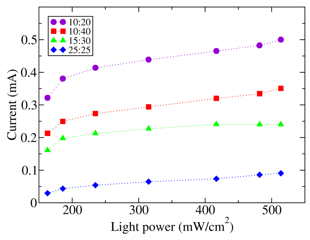 A series of measurements of the current with a 10 V fixed bias voltage were performed by illuminating the sample by means of the xenon lamp of a solar simulator with a power light on the polymer surface between 160 and 515 mW/cm2. The results show a linear dependence of the photogenerated current in relation to the incident power in the range between 200 and 515 mW/cm2 (Figure 5). Other studies with lower intensities show that the range of linearity extends to the dark condition [23].