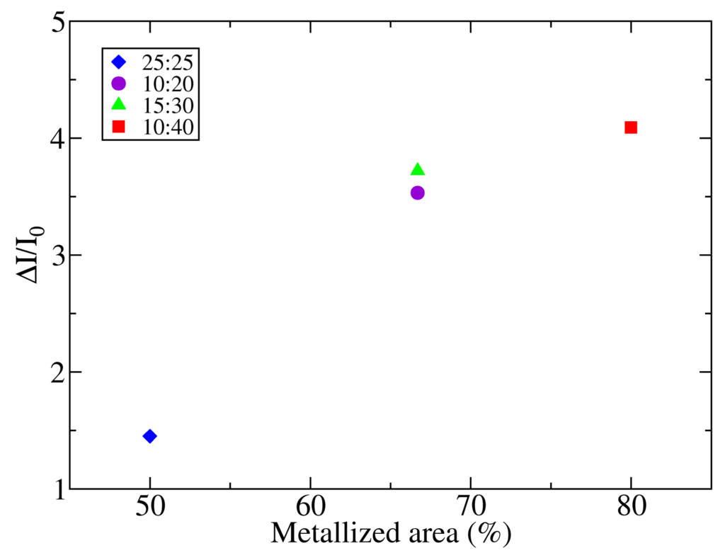 In order to assess the influence of the electrodes on the photodetector response, the photogenerated current relative to the dark current (ΔI/I0 = (I − I0)/I0) has been compared to the area fraction covered by the metal fingers in the four electrodes. The results have been plotted in Figure 6. The lower relative increment of current when the photodetector is illuminated is found for sample 25:25, which is the device with a lower amount of metalized area (50%). Samples 10:20 and 15:30, which have the same fraction of metalized area (67%), show similar levels of relative photogenerated current, although the absolute current of sample 10:20 is almost twice the absolute current of sample 15:30. Moreover, these samples show higher photogenerated current than sample 25:25. Finally, sample 10:40, with 80% of the active area covered with metal, shows the higher ΔI/I0 ratio. Hence, although the absolute current depends mainly on the finger separation (s) and gap width (w), as has been shown in Section 3.1, the key parameter that governs the sensitivity of the photodetectors is the metalized area.