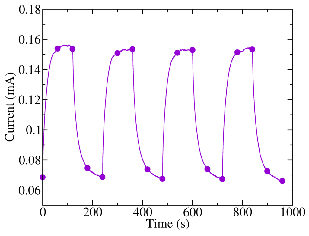 Finally, a study of the response of the photodetectors to changes in lighting was performed. The samples were biased with a voltage of 10 V and were exposed to pulsed dark/light cycles, alternating from darkness to 240 mW/cm2 light power, with a period of four minutes (two minutes with light and two minutes in darkness). The graph of the measured current in these conditions is shown in Figure 7. It can be observed that there is a slow response of the photogenerated current when abrupt changes of lighting are applied, which is in good agreement with previous results found in the literature [23]. Likewise, the rise time is slightly shorter than the fall time. Specifically, the mean time needed to reach 90% of the maximum current value was 35 s, while the fall time to 10% of the maximum current was 48 s, similar values to those found for pristine P3HT thin-film photoconductors [23] and phototransistors [31]. Whether the change of current is related to an interband transition or to a photoassisted physical or chemical process remains unclear. Although photodetectors held the maximum and minimum current levels in light and dark conditions throughout the experiment, which suggest an interband charge generation, the current transient is remarkably slow. Simulation of the response to illumination in phototransistors shows that the electric field and the carrier gradient are low. Thus, longer times should be required to relax the exceeding carrier once the light is turned off. It has been shown previously that light enhances the reversible generation of charge transfer complexes in this polymer [32], P3HT phototransistors [33,34] and P3HT solar cells [35], which could explain the slow variations of the photogenerated current. Nevertheless, it has also been found that the dark current levels after several cycles of illumination and darkness are higher than the dark current before illumination [34], suggesting that photoassisted molecular oxygen doping is not a completely reversible process.