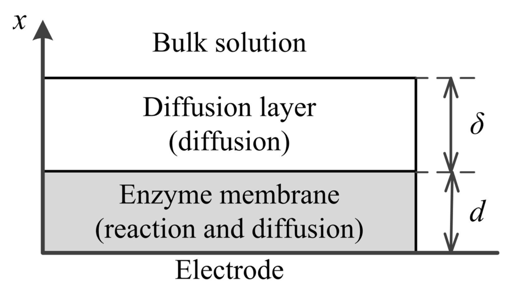 Assuming a symmetrical geometry of the electrode and a homogeneous distribution of the immobilized enzyme in the enzyme layer of a uniform thickness, the mathematical model of the biosensor action can be defined in a one-dimensional-in-space domain [26,27].