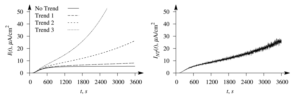 The evolution of the typical biosensor responses is illustrated in Figure 2, where the left plot shows the signals affected by the exponential trend of a different rate and the right plot the response affected by the trend, entitled Trend 2, in conjugation with the white Gaussian noise at σ = 0.05. The simulation was performed at the maximal enzymatic rate V1 = 0.5 μM/s for the first substrate and V2 = 10 V1 = 5 μM/s for the second one; the concentration of the first substrate was S1,0 = 3.2K1 = 0.32 mM and S2,0 = 4 S1,0= 12.8K2 = 1.28 mM of the second substrate, and the thickness of the outer diffusion layer was δ = 1 mm. Values of the other parameters were as defined in Equation (16). At the values used in the simulation, the Biot numbers were β1 = β2 = 0.4 and the diffusion modules: , .