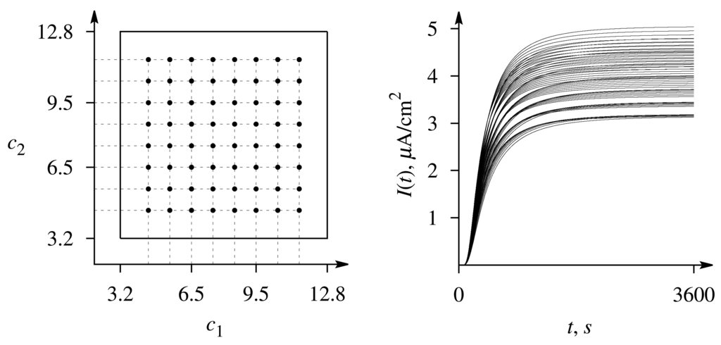 The feasible region for the concentrations c = (c1, c2) has been chosen to be C = [3.2, 12.8]2, assuming that the concentrations are dimensionless and normalized with respect to the corresponding Michaelis constant as follows: ci = Si,0/Ki, i = 1, 2. The biosensors calibration curve is usually linear at the substrate concentrations lower than the Michaelis constant, and then, the determination of the analyte concentration from the biosensor response is rather simple [1,2,4]. Because of this, the feasible region was chosen so that Si,0 > Ki, i = 1, 2, when the concentration determination is more complex.
