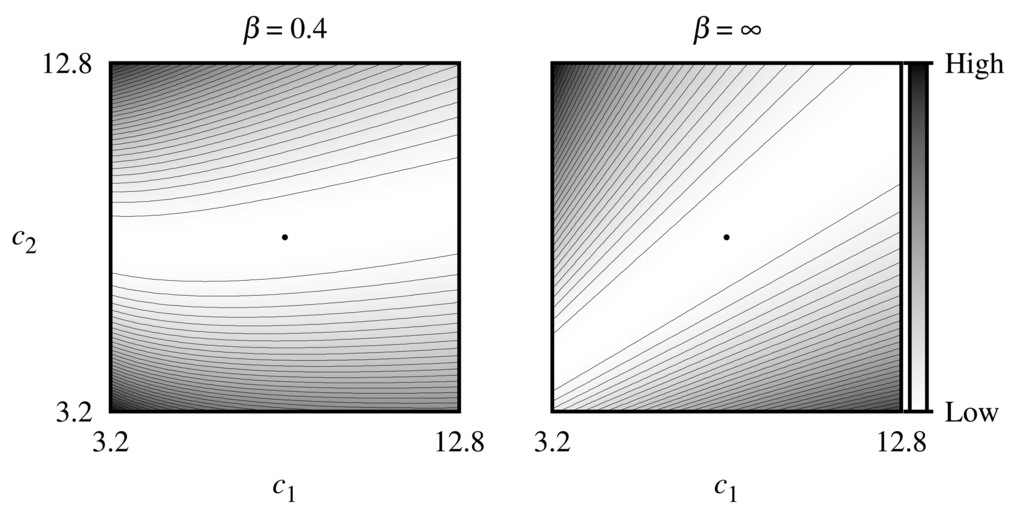 The sensitivity of the estimates of the concentrations is illustrated by Figure 4, where contour lines of the objective function given by Equation (17) for the noise-free biosensor responses were simulated at V1 = 0.5 μM/s, V2 = 5 μM/s assuming zero thickness (β = ∞) of the external diffusion layer, as well as the relatively thick (β = 0.4) diffusion layer, where the true dimensionless concentrations (c1, c2) of the substrates were equal to (8, 8). As one can see in Figure 4, the objective function for both values of β-parameter is unimodal in the region of interest, and the minimum point lies in a wide flat valley, which is curved and can negatively influence the convergence of the gradient-based algorithm when β = 0.4.