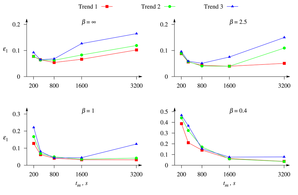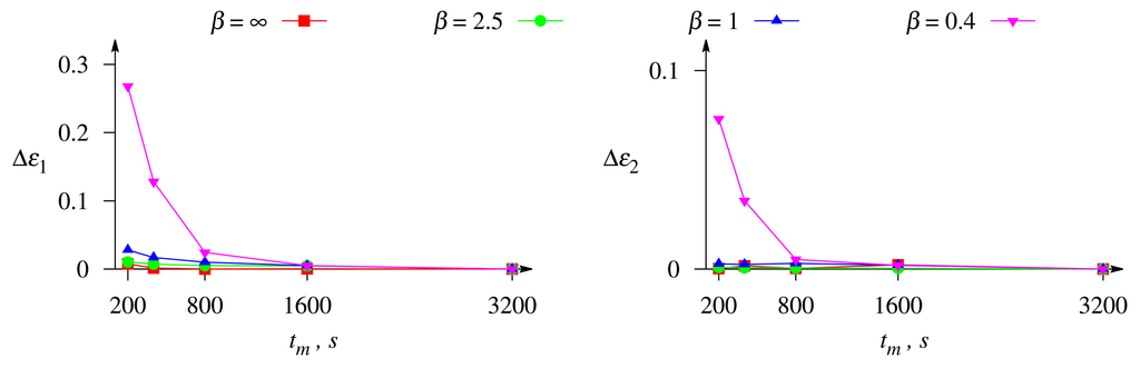One can see in Figure 7 that the relative error, ε1, of the evaluation of the substrate concentration as a function of the Biot number can be of a different monotonicity. The error, ε1, is a monotonous decreasing function of the Biot number, β, in the case of short-term responses (tm ∈ {200, 400} s), while in the case of long-term responses (tm ∈ {800, 3, 200} s), the monotonicity of the function, ε1(β), depends on the trend rate.