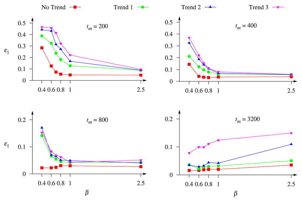 Figure 6 presents the relative error, ε1, of the estimate, c̃1, of the substrate, S1, versus the duration, tm, of the biosensor action. The error, ε1, was calculated for different values of the Biot number, β, when the biosensor response is affected by white Gaussian noise with σ = 0.05 (see Equation (14)) in conjugation with the exponential trend (see Equations (13) and (18)). The biosensor current was calculated as defined in Equation (15). In Figure 6, different curves correspond to the different rates of the exponential trend (see Table 1), and different plots to the different Biot number, β.