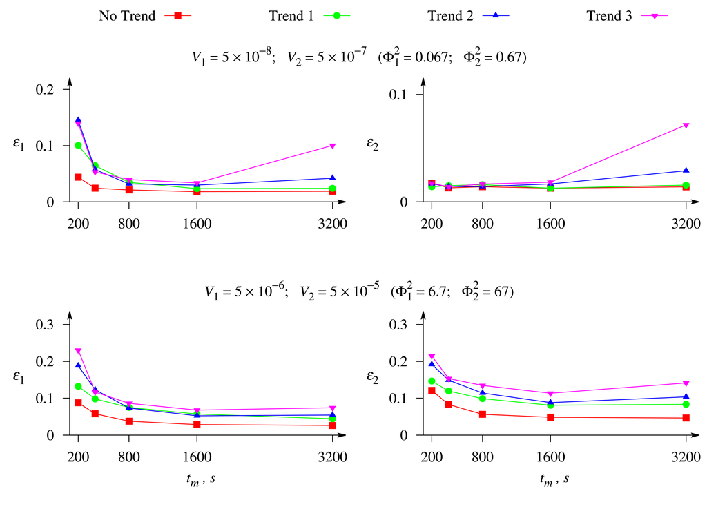 Figure 8 shows the relative errors, ε1 and ε2, of the evaluation of the concentrations of both substrates, S1 and S2, versus the duration, tm, of the biosensor operation at different values of the maximal enzymatic rates, V1 and V2, and a moderate value of the Biot number β = 1. The response was affected by white Gaussian noise with σ = 0.05 and by the exponential trend of a different rate.