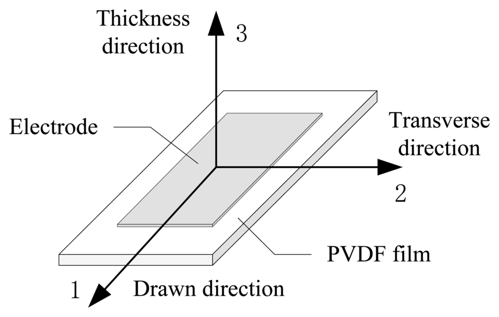 Figure 1 is schematic picture of a PVDF film. The sensitivity of the PVDF film depends on the direction of measurement. The coefficients d31, d32, d33 are the piezoelectric strain coefficient of the direction 1, 2, 3, respectively and −d33 ≥ d31 > d32 > 0. The coefficients d24, d15 are the piezoelectric shearing strain coefficient of the film sides in the direction 1, 2, respectively. For the commercially available PVDF film, the piezoelectric shearing strain coefficients are smaller than the piezoelectric strain coefficients about two orders of magnitude.