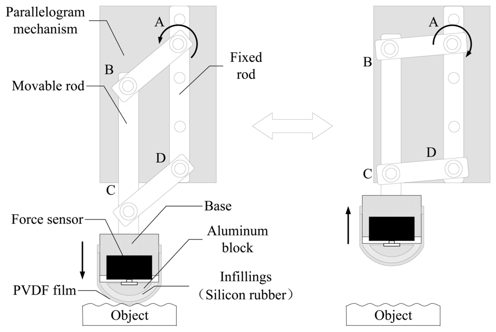 The parallelogram mechanism is designed to ensure that the sensor is pressed perpendicularly to the surface of the object. It has three movable rods and one fixed rod connected to the motor shaft in point A of Figure 2. When the motor shaft rotates anticlockwise, the sensor will go down slowly to contact the surface along the vertical direction. Meanwhile, the contact force is detected by the installed force sensor. As soon as the contact force reaches a certain value, the motor will stop. Then the contact force between the sensor and the surface won't be changed owing to self-locking function of the motor. Here, we use a FSG1500g touch force sensor manufactured by the Honeywell Corporation (Morristown, NJ, USA) to measure the normal contact force between the PVDF film and the surface of objects. Its measuring range is 15 N with a measurement precision of 0.5% F.S., and its resistance to overload reaches 55 N.
