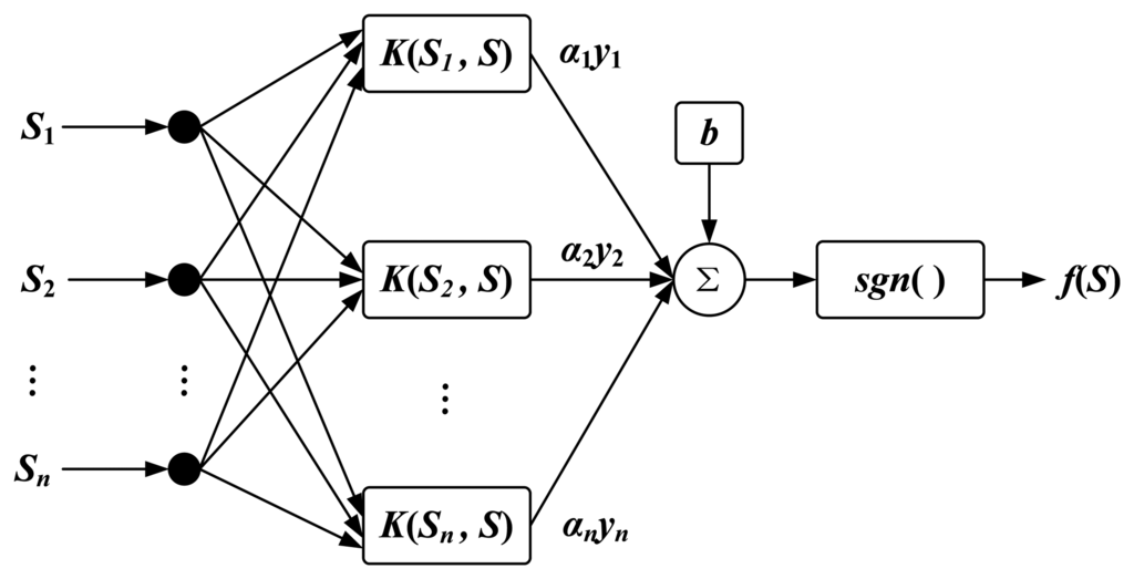The training data is used to determine the classification function f(S). As shown in Figure 5, the mathematical form of f(S) is similar to a three-layer feedforward artificial neural network.