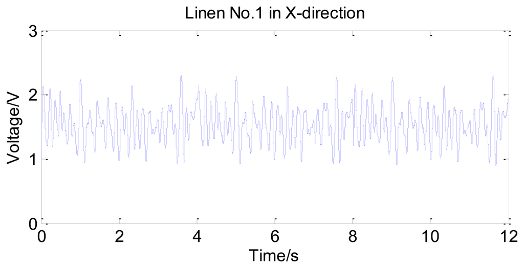 As shown in Figure 6a, some fabrics have different properties in the X-direction and Y-direction. Humans can easily distinguish between the two directions by tactile sensation. Thus tactile signals in different directions are valuable in evaluation. To get comprehensive surface mechanical properties, tactile signals are acquired in both directions during the experiment. The contact force of the tactile sensor applied on the sample of linen is set to be 1.5 N, which is within the fingertip touch force range of 1.54 ± 0.50 N. The sliding speed is set to be 2.55 cm/s, which is ensured by the encoder installed on the step motor. For instance, Figure 7 shows the raw data of linen No.1 in the time domain, which is acquired in the X-direction.