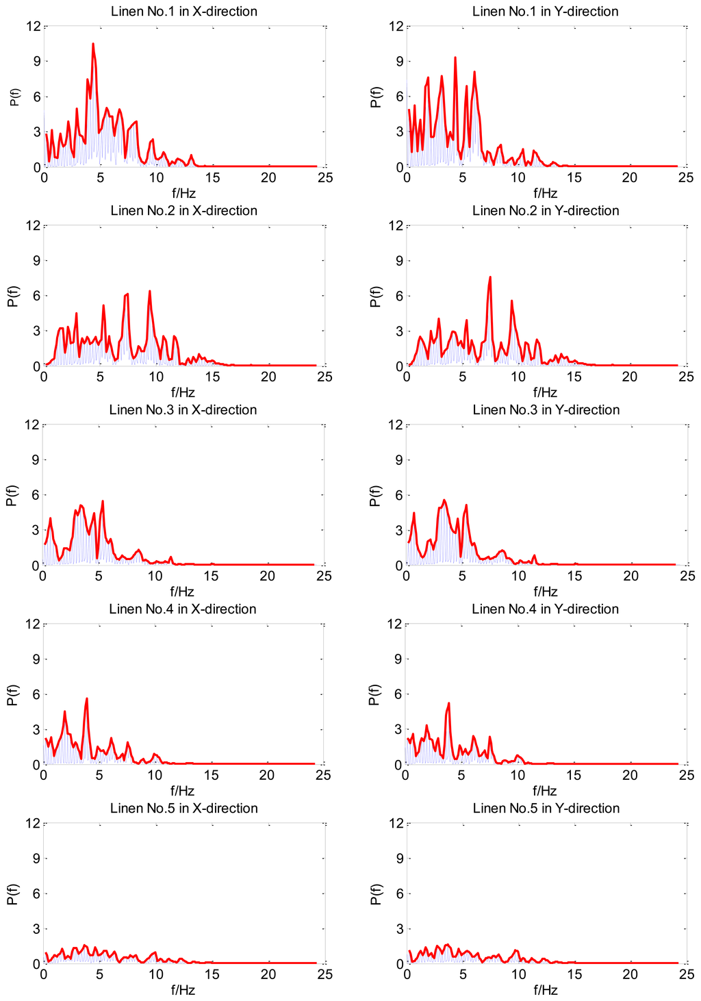 Figure 8 displays the power spectrum density of the five types of linen. The left charts show texture information in the X-direction, and the right charts in the Y-direction. The thick line is the power spectrum density envelope, which can facilitate observation of spectral peaks. As shown in the figure, the surface mechanical features of linen No. 1 are different in the X-direction and Y-direction. However, the remaining four kinds of linen show similar mechanical features in the X-direction and Y-direction, which indicates that their woven structures of the two directions have little difference. Meanwhile, each kind of linen has its own features in the frequency domain. Thus, imitating the motion of human finger, this finger-shaped tactile sensor is capable of detecting in two directions.
