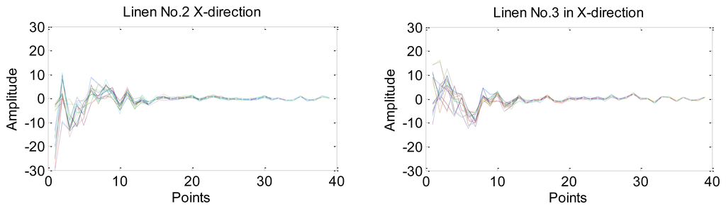 We use PCA to reduce the dimension of features in the frequency domain. Taking linens No. 2 and No. 3 for instance, each of them has 60 groups of data in the X-direction, so the matrix X can be 60 rows and 12,288 columns, which means n = 60 and m = 12,288. Then the dimension reduction results can be calculated using Equations (7) to (12). To make uk > 99%, k is set to be 39. Eventually, the 12,288 points can be reduced to a 39 dimensional vector of each sample. Figure 9 shows the dimension reduction results of linen No. 2 and linen No. 3. Lines with different colors represent different groups of data and each figure has 60 curves in total.