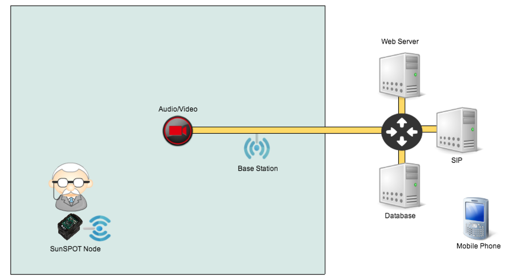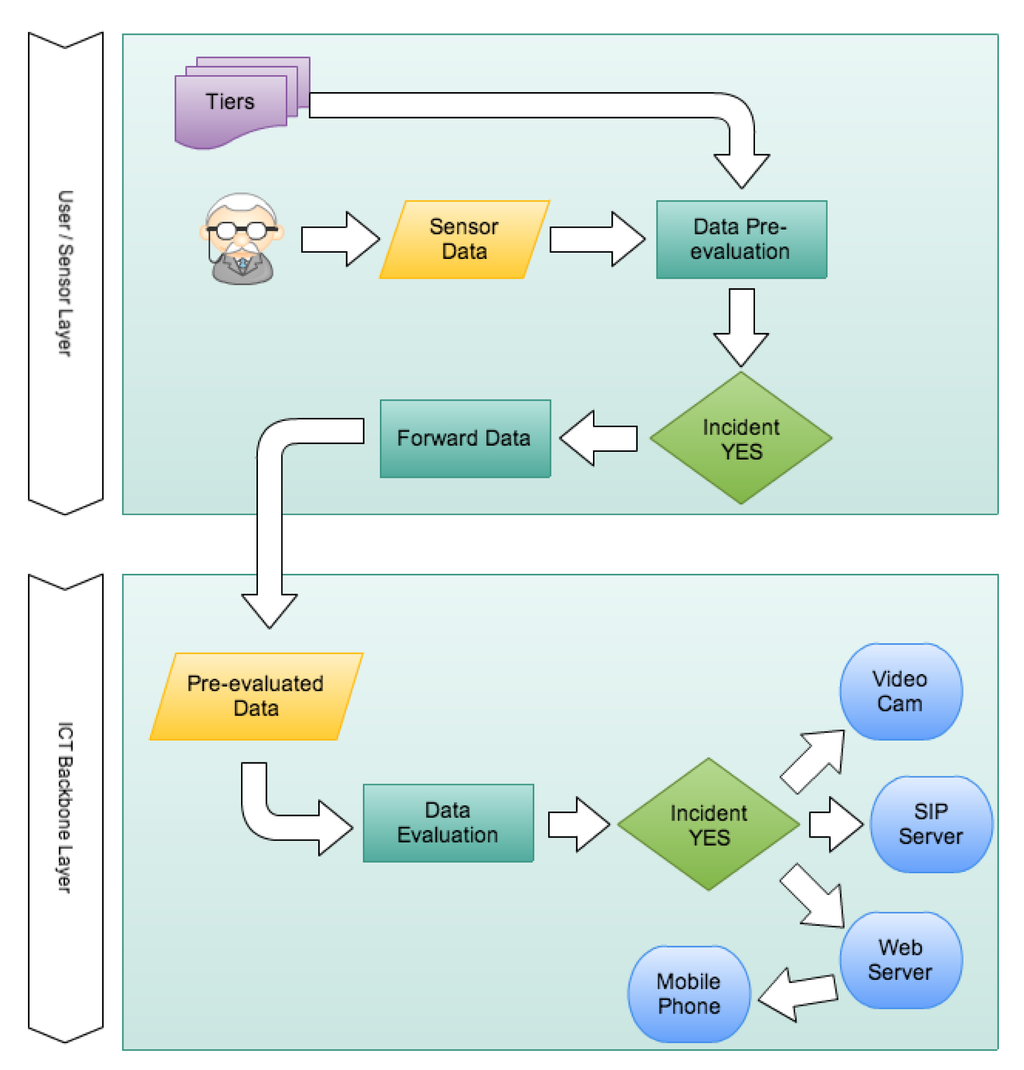 The Session Initiation Protocol (SIP) server acts as gateway to an external service provider in order to establish a communication link an external device such as a mobile phone. Finally, the Web server offers configuration and maintenance capabilities for the care personnel. In the test-bed, a critical situation that could occur during ADLs of an elderly person is simulated. If the person falls, the sensor will detect the fall and inform the backend system about the incident. The system will then establish a connection to an audio/video device, so the care personnel can contact the person to ask what happened. In this particular case, the call is relayed to a mobile phone.