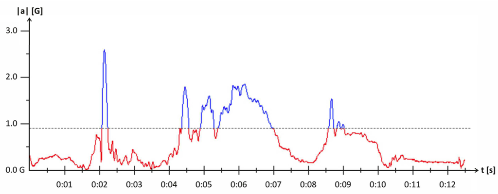 The calculation for the actual thresholds for the present publication was performed according to the work of [38]. The Euclidian distance of all vector elements including static and dynamic vector elements was calculated via Equation (1), based on the sensor node's accelerometer measurements. The elements ax, ay, and az represent the acceleration in the respective x-, y-, and z-axes.