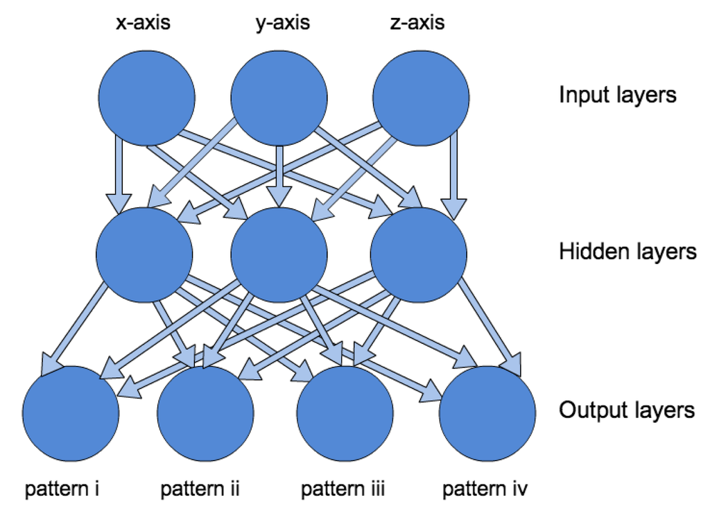 In contrast to the approach applied within the threshold-based design, every axis of the accelerometer directly influences the neural network. Each axis provides individual input parameters within the input layer. The classification results are presented within the output layer. In order to successfully train the MLP (meaning that the weights before and after the hidden layer are adjusted properly for the specific dataset), all movements that should be detected have to occur sufficiently often during the training phase [41].