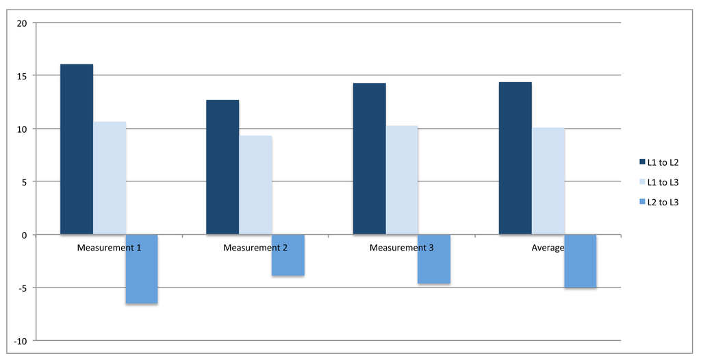 An interesting fact from the transition from L2 to L3 (Tables 2 and 3) is the amount of energy that can be saved. The energy consumption in L3 is increased in contrast to the transition from L1 to L2. Based on the hypothesis, this behaviour was unexpected. However, as it was demonstrated in previous research [42], a significant energy drain can be observed during idle and overhearing periods. This drain can be as high as transmitting or receiving data [42]. Therefore, it can be stated that it is not possible to reduce the overall energy consumption related to the radio device below a certain value. In addition, for the hypothesis it was assumed that the trade-off in regard to the introduction of the intelligence level L2 and L3 would be still in favour of energy savings. However, the negative results (see Figure ) indicate that the calculations performed by L3 eliminate the energy savings resulting from the reduced communication payload.