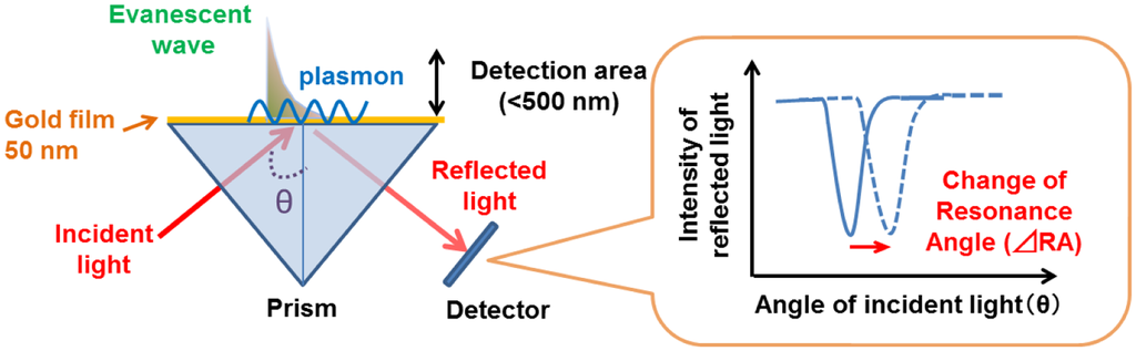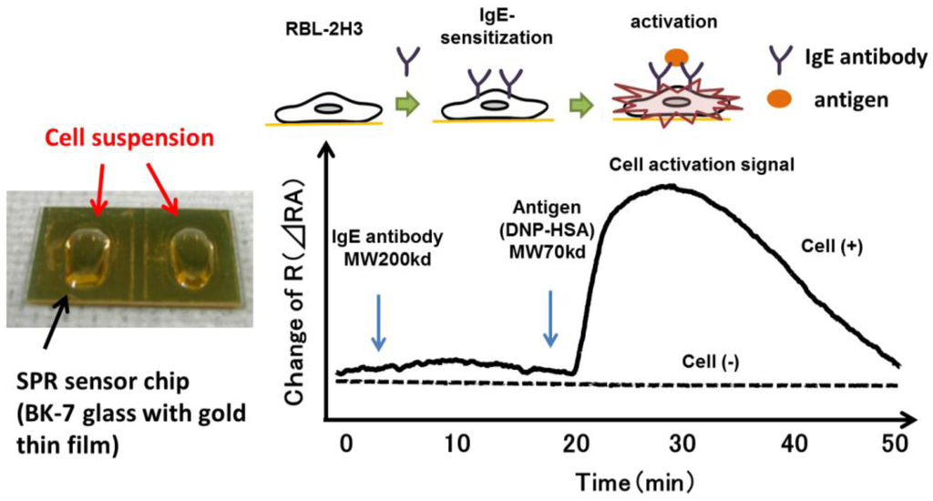 SPR reflects the reflective index (RI) in the evanescent field on a metal. The resonance angle (RA) for SPR changes proportionally to the density of biological molecules in the evanescent field (<500 nm) on the other surface of the metal, whose thickness is smaller than the wavelength of the incident light. Thus, SPR can detect in a real-time manner the association and dissociation of biological molecules on a surface gold film without any labeling [9–12]. During the past two decades, SPR based-biosensors have been widely employed for label-free, real-time analyses of different biological molecules, such as antibody and antigen, receptor and ligand, and complementary DNA fragments in physiological conditions (Figure 1). In 2002, we first reported that living RBL-2H3 cells, a cognate rat mast cell line, caused an unexpectedly large increase of RA in response to biological stimuli beyond that due to a simple binding of IgE antibody to the cells (Figure 2) [13]. Large changes of RA due to cell activations have been found in other cells, such as basophils and lymphocytes obtained from human blood, and epidermal cells [14]. To employ SPR as a real-time, label-free biosensor to study cell activities in a wide range of bioscience and clinical medicine scenarios, we studied the relation of SPR signals to intracellular signal transductions, and have developed a glass-fiber SPR that detects cell reactions on the fiber tip, and a 2-dimensional SPR system that visualizes single cell reactions.