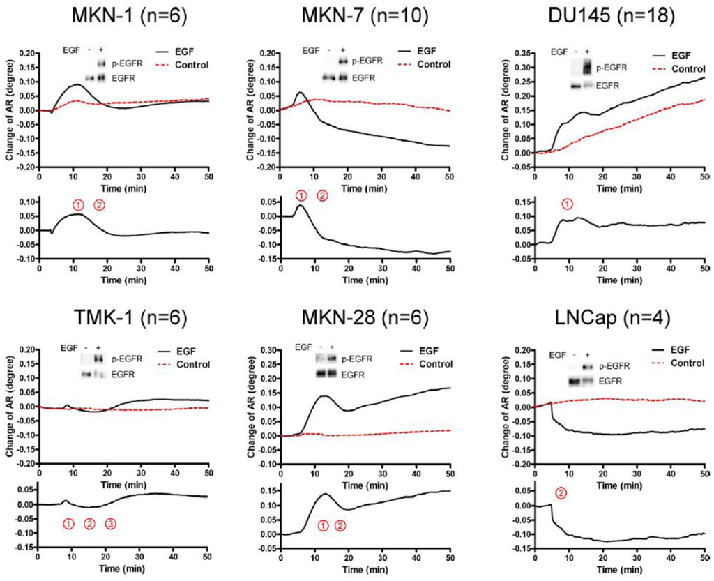 The activation of epidermal growth factor (EGF) receptor (EGFR) on epidermal cells, such as keratinocytes, causes a unique triphasic change of RA, whereas the activation of other receptors, such as the high affinity IgE receptor (FcεRI) on mast cells and basophils, causes a monophasic increase of RA. Chinese hamster ovary (CHO) cells transfected with cDNA for EGFR also showed a triphasic change of RA. However, when CHO cells were transfected with cDNA for EGFR containing a mutation at its kinase domain, they showed a minimal change of RA. Moreover, a phosphatidylinositol 3-kinase inhibitor attenuated the third phase of RA change in CHO cells expressing wild-type EGFR. Furthermore, the pattern of RA change was independent of EGF concentration. These results suggest that EGF induces the SPR signals via the phosphorylation of EGFR, and that an impaired pattern of SPR signal induced by EGF may reveal a disorder in intracellular signal transductions of abnormal cells, such as cancer cells. In fact, we found that five out of six carcinoma cell lines showed mono- or bi-phasic change of RA (Figure 3). These results suggest the potential for the SPR biosensor tobe applied to the real-time detection and/or diagnosis of malignant tumors [16].