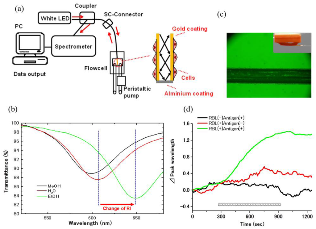 The application of an optical fiber sensors-based SPR phenomenon has been reported for the analysis of liquid or gas samples [47,48]. To apply SPR biosensors for the inside of the body, we developed an optic fiber SPR for living cells analysis. The core of 200 μm diameter with 1cm length of an optical fiber was coated by gold film with 50 nm thickness. The light provided by a white LED and attenuated due to an SPR phenomenon in the sensor part was analyzed using a spectrum detector. RIchanges on a gold surface were indicated by shifts of the wavelength of the maximal absorption (Figure 4). Using this sensor, the difference in solvents with various RI and protein bindings to the sensor chip was detected with sufficient sensitivity. Moreover, when RBL-2H3 mast cells were fixed onto the sensor tip surface by means of the droplet method, it detected a sustained increase of RI in response to antigen [32].