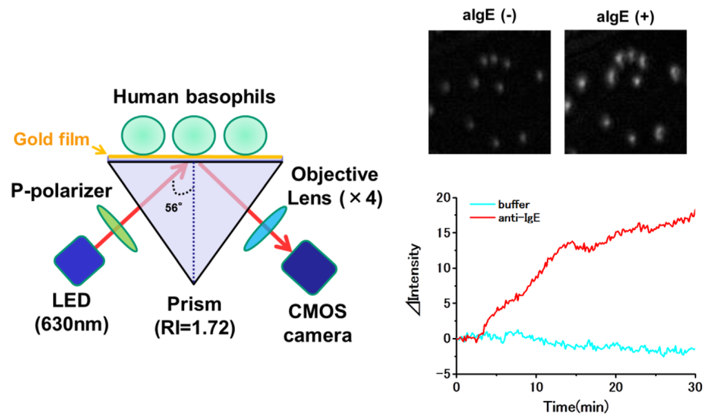 - Yanase, Y.; Hiragun, T.; Yanase, T.; Kawaguchi, T.; Ishii, K.; Hide, M. Evaluation of peripheral blood basophil activation by means of surface plasmon resonance imaging. Biosens. Bioelectron. 2012, 32, 62–68. [Google Scholar]