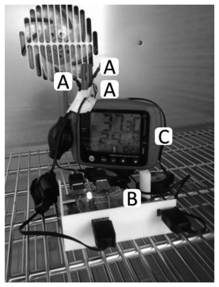 At the time of the TR300 first flash, indicating the start of the programmed recording, the Seeeduino Datalogger was activated and the oven doors were closed. The following temperature ramp was applied in steps of 5 min: 30°, 33°, 36°, 39°, 45°. The actual temperature readings and absolute time were noted from the FD240 display. Humidity could not be controlled, since the FD240 does not have this feature. After completion of the rump, the FD240 doors were opened and the systems stopped. Recordings were then downloaded from TR300 and the Seeeduino Logger to a personal computer.