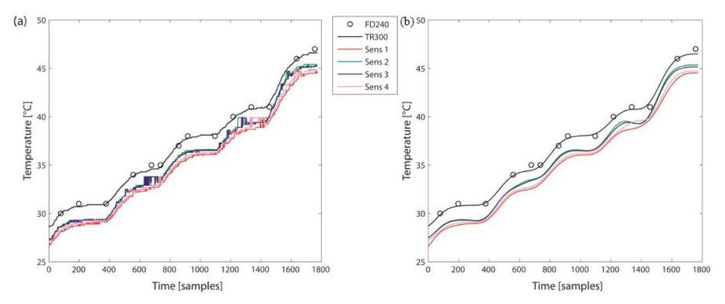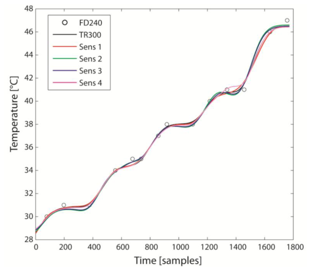There was a good agreement between FD240 and TR300, as reported in Table 2. The RMSE = 0.3 °C even without the compensation for a limited offset. The CR was within 0.55 °C. These findings support the use of TR300 as reference for the Sensirion sensors.