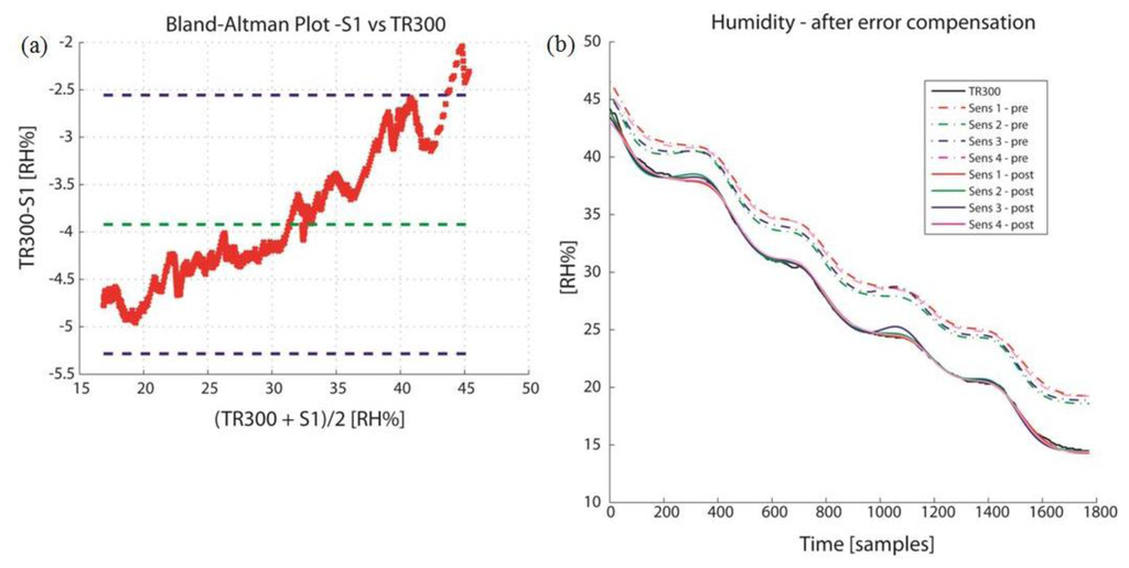 All the S sensors were consistent in overestimating the humidity compared to TR300, with 95% probability deviations, as reported by CR in Table 3. There was a clear correlation in the Bland-Altman plot between the error (Y) and the true value estimation (X) for all sensors, as reported in Figure 4a for Sensor 1. The application of a sensor-specific calibration model was effective in improving the agreement, (see Table 4 for the calibration model parameters in the time domain), with the final outcome reported in Figure 4b. All sensors are acceptable after calibrations, but Sensors 1 and 4 gave the best results.