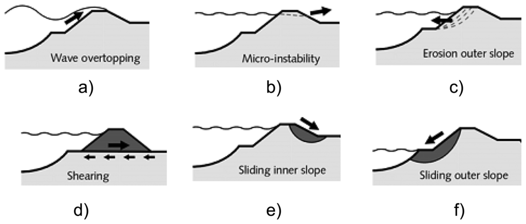 Between 1134 and 2006 there were 1,735 dike failures in The Netherlands [9]. Of these events 67% were caused by erosion of inner slope protection, 11% by ice drift, 6% by erosion or instability of outer slope protection (Figure 1c), 5% by sliding inner slopes (Figure 1e), 4% by external reasons (human and animal), 3% by sliding outer slopes (Figure 1f), 2% by liquefaction of the shore line, 1% by piping, 1% by micro-instability (Figure 1b), horizontal shear (Figure 1d) and other related mechanisms.