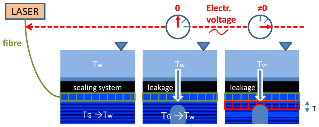 GTC Kappelmeyer uses a heat-pulse method [47] that provides robust leakage detection also in autumn and spring when ground (TG) and water (TW) temperatures are nearly equal (Figure 11). Area of leakage is presented with an arrow in the central area of central and right pictures in Figure 11. The fibre optic cable is heated up (central picture in Figure 11) by sending an electrical current through the metallic cable coating (e.g., rodent protection, shielding). The temperature increase in the immediate surroundings of the cable depends on the heat capacity and heat conductivity of the outcrop. While having seepage flow the poorly conductive heat transport is superimposed by the much more effective advective heat transport. Therefore, clearly visible temperature anomalies arise in these areas during the process of heating (difference of temperatures is shown with red figures in the right hand picture in Figure 11): temperature in area of seepage is lower in comparison to dry soil.