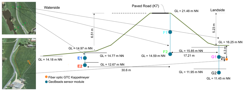 There are two types of sensors installed in the Rhine river levee: Alert Solutions (GeoBeads) in 2 cross-sections and a GTC Kappelmeyer fibre optic cable (250 m) placed across the levee (Figure 12). One of the two Alert Solutions cross-sections is presented in Figure 12.