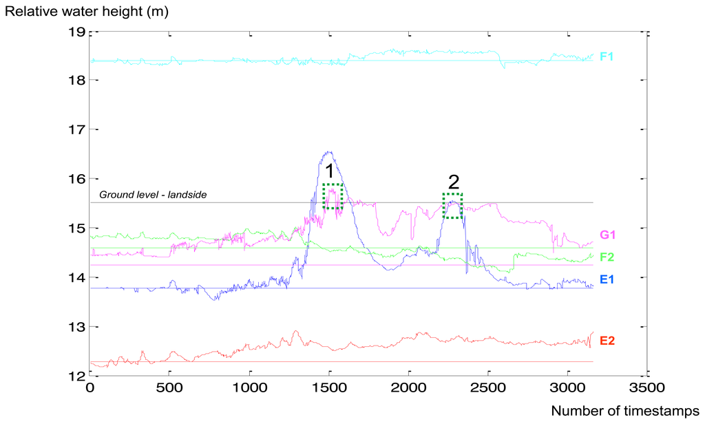 The two green dotted boxes in Figure 13a indicate the dates when the water level was higher than the ground water level (G1 sensor): 1st box—9th of January 2012, 2nd box—25th of January 2012. These peaks correspond to peaks in the Rhine water level of 820 cm and 710 cm [47]. According to the reported data the levee was wet, but “strong seepage flow (>10−4 m/s) can be excluded.” Summarizing all the aspects mentioned above, Alert Solutions sensors are useful for levee behaviour classifications (dry/wet). If piping starts close to the GeoBeads sensors, it will be easily detected. GTC Kappelmeyer fibre optic sensor should be applied for leakage testing between cross-sections.