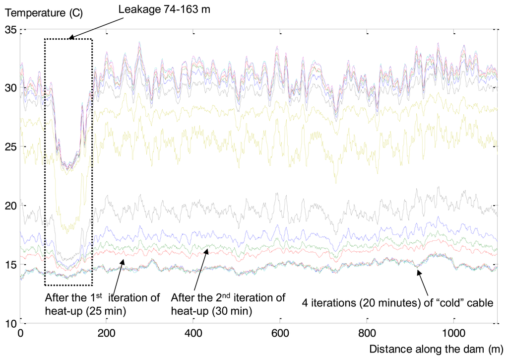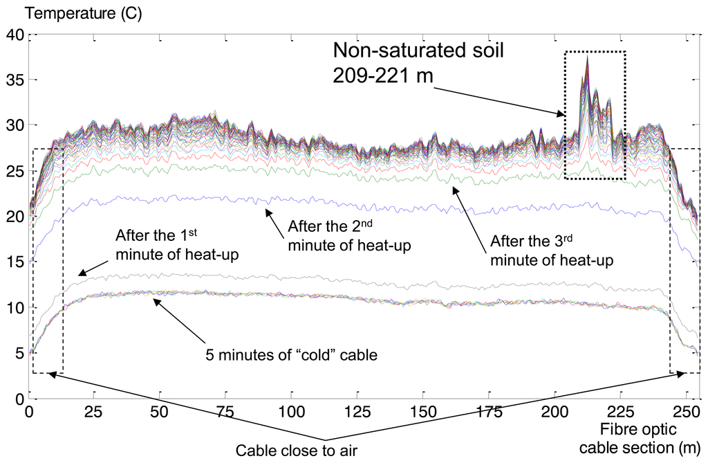 In this section we describe the collected GTC Kappelmeyer temperature measurements and the associated analysis. The process of a fibre optic heat-up is presented in Figure 14. As previously mentioned [47], there was no piping detected, so the levee’s condition is normal. The only phenomena in collected temperature measurements that could be interpreted as anomaly is about 15 m wide area (Figure 14—dotted box) of non-saturated soil. This means that soil contains holes that contain air. Air has high insulation quality (thermal conductivity ∼0.4 W/m/K), which leads to measured high temperatures: the temperature across the whole cable is more or less the same during the heat-up process, about 28–30 degrees, but for the range of 209–221 meter (fibre cable optic length) the temperature is much higher.